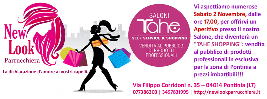 Informiamo la nostra clientela che abbiamo compiuto un passo importante: da Sabato 2 Novembre, infatti, il nostro Salone diventerà a tutti gli effetti un «Tahe Shopping». La Tahe, Azienda spagnola leader nel settore dell’Acconciatura e nell’Estetica, ci ha selezionato per concederci in esclusiva per il territorio di Pontinia la vendita al pubblico di prodotti professionali, e a prezzi decisamente molto competitivi!