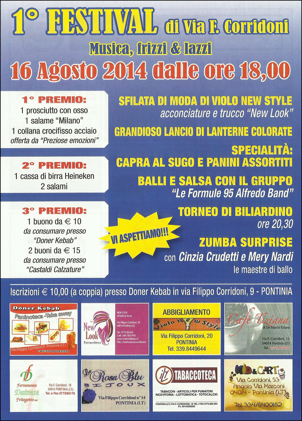 In occasione dell’Estate, tutti i commercianti di Via Filippo Corridoni a Pontinia si sono accordati e hanno organizzato il «1° Festival di Via Corridoni»: musica, frizzi e lazzi. Un modo per stare insieme e divertirsi Sabato 16 Agosto. A partire dalle ore 18,00 ci sarà la musica (balli e salsa di gruppo) con il Gruppo «Le Formule 95 Alfredo Band», oltre a Zumba Surprise, con la partecipazione di Cinzia Crudetti e Mery Nardi, maestre di ballo. Alle ore 20,30 Torneo di Biliardino con premi: per le iscrizioni rivolgersi presso il Doner Kebab di Pontinia (€ 10,00 a coppia). A partire dalle ore 21,30 circa il pezzo forte della serata: una Sfilata di Moda con abiti di «Violo New Style» ed acconciature e trucco a cura di «New Look di Bottoni Anna»; in tale occasione vi presenteremo anche opere di Body Painting! E ancora: capra al sugo e panini assortiti con «Cafè Tiziana». Gran finale con un grandioso lancio di lanterne colorate. Non mancate!