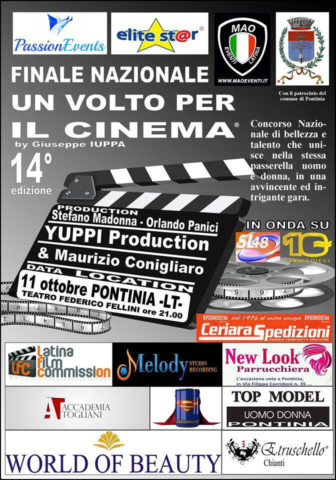 Sabato 11 Ottobre 2014, a partire dalle ore 21,00, avrà luogo la Finale Nazionale della 14^ Edizione del Concorso di bellezza e talento «Un Volto per il Cinema». La location scelta è Pontinia, e precisamente il Teatro Fellini, sito nel centro Storico della città, in Piazza Indipendenza. Il Concorso, realizzato da Stefano Madonna, Orlando Panici – Yuppi Production – e Maurizio Conigliaro, si differenzia da ogni altro dello stesso tipo perché unisce nella stessa passerella uomo e donna, in una avvincente ed intrigante gara, e tende ad individuare attraverso le numerose Selezioni, elementi nuovi dotati di talento, personalità e dalle precise caratteristiche professionali per essere proposte nel Mondo del Cinema, della Moda, della Pubblicità e della Televisione. Il nostro Staff, nelle persone di Anna Bottoni e Pamela Frascadore, saranno protagoniste nel backstage di preparazione delle acconciature delle ragazze e dei ragazzi che saranno i finalisti dell'evento! Il concorso - che andrà in onda su SL48 e su Canale 10 - ha visto come vincitori nel passato nomi importanti come Debora Caprioglio e tanti altri.