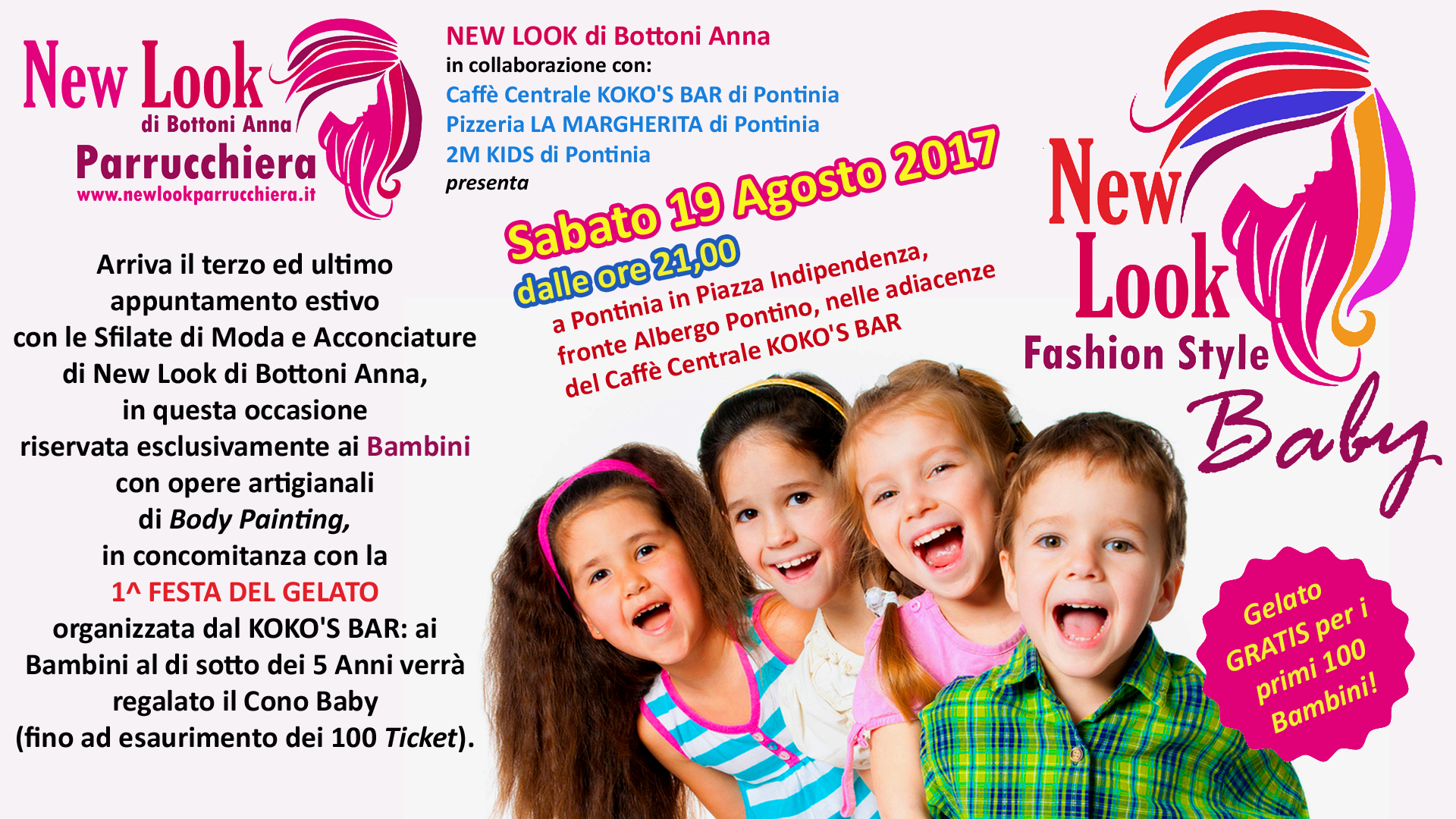 Proseguono gli appuntamenti proposti dal nostro Salone inseriti nella c.d. “Estate Pontiniana” patrocinata dal Comune con l’ultima delle nostre iniziative per questa stagione, questa volta incentrata sui più piccoli: Sabato 19 Agosto, infatti, in Piazza Indipendenza, vi presentiamo la terza e ultima puntata di «New Look Fashion Style», evento in tre tappe che dopo Borgo Vodice e la stessa Piazza Indipendenza, torna al centro del Paese per una Sfilata dedicata esclusivamente ai Bambini, anche con opere artigianali di Body Painting. La passerella, realizzata con il fattivo supporto di 2M Kids di Livia Macciacchera, si terrà in concomitanza con la 1^ «Festa del Gelato» del Koko’s Bar: ai primi 100 Bambini sotto i 5 anni di età che ne faranno richiesta, sarà offerto gratuitamente un Cono Baby. Ma saranno anche distribuiti gratuitamente palloncini e gadget. La serata si concluderà con il consueto intrattenimento musicale tipico del periodo estivo, rivolto a tutte le famiglie.
