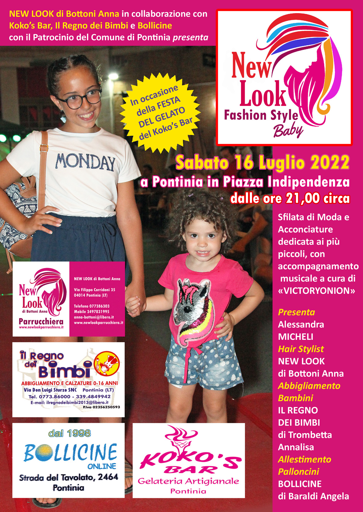 La scorsa Estate qualcosa si poteva anche fare, in tema di Eventi, ma era veramente troppo complicato con Mascherine obbligatorie e distanziamento sociale (con conseguente riduzione del numero dei potenziali spettatori), per cui abbiamo preferito rinunciare a proporre le nostre Sfilate, che non sarebbero riuscite come al solito. Adesso, invece, è tornato possibile realizzare incontri dal vivo, vista la cessazione dello stato d’emergenza, nonostante il Covid-19 non sia ancora stato sconfitto. Ma sussiste in tutti la voglia di un seppur graduale ritorno alla normalità. A distanza di ben tre anni, così, torniamo in pista: si comincia con il tradizionale «New Look Fashion Style» nella versione “Baby”, che si terrà Sabato 16 Luglio 2022 in Piazza Indipendenza, nelle adiacenze dell’ex Albergo Pontino. La Sfilata di Moda e Acconciature, quest'anno dedicata esclusivamente ai più piccoli, sarà presentata, per la prima volta, da Alessandra Micheli, con l’accompagnamento musicale di «Victoryonion»; inserita nel Calendario degli Appuntamenti della cosiddetta «Estate Pontiniana» del Comune di Pontinia, è realizzata in partnership con il Koko’s Bar, che presenta in contemporanea la tradizionale «Festa del Gelato», oltre a provvedere al servizio di ristorazione ai tavoli, mentre “Il Regno dei Bimbi di Trombetta Annalisa” fornirà i vestiti dei bambini e “Bollicine di Baraldi Angela” curerà la scenografia dei Palloncini (a tema marino). Non mancheranno Mascotte e Truccabimbi! La serata sarà ripresa dalla televisione locale SL48 e prossimamente trasmessa in differita. Un’altra Sfilata a marchio New Look, con l’organizzazione dell’Associazione Pontinia In Festa, sarà allestita in occasione della Festa Patronale in onore di Sant’Anna, che torna a grande richiesta dopo due anni di forzato stop.